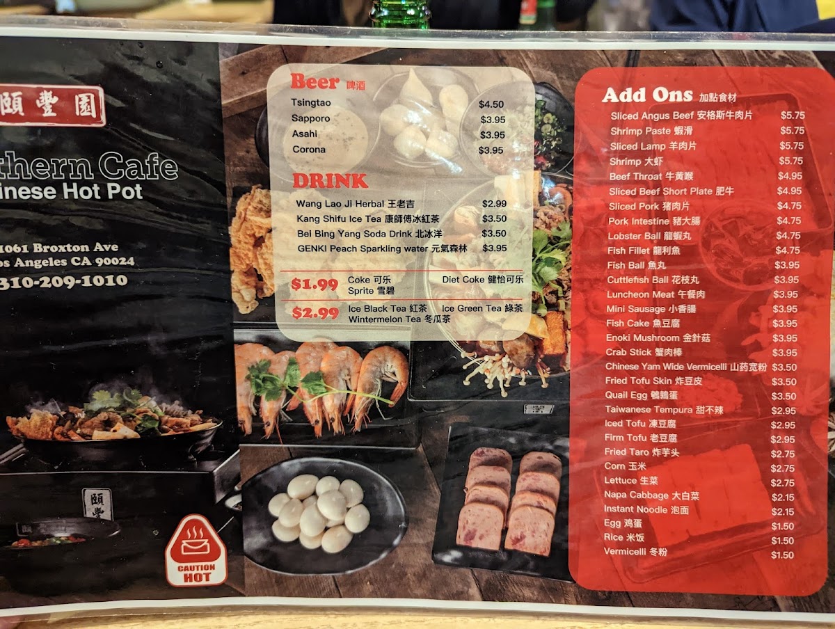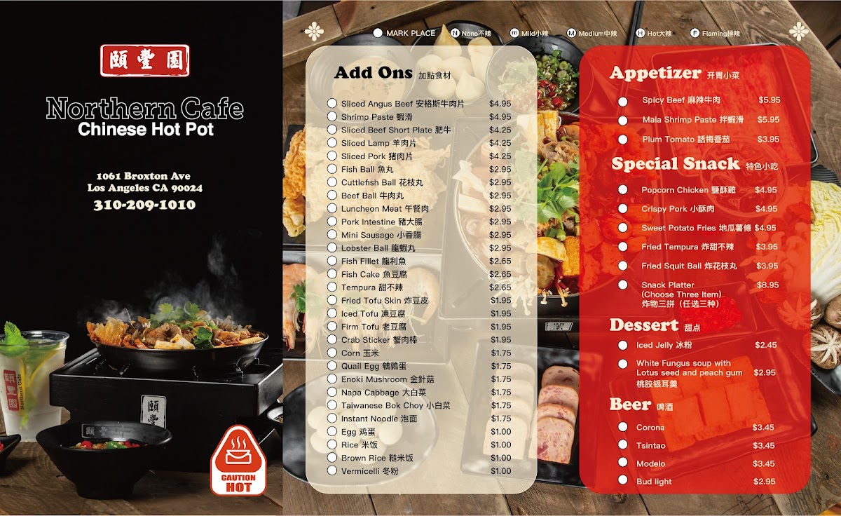 This menu is well-suited for casual dining, particularly for those looking to enjoy a customizable, interactive hot pot meal. It is an option appropriate for lunch, dinner, or any time a hot pot craving arises. The inclusion of side dishes and add-ons allows for quick orders or a more varied meal depending on the diner's preference.